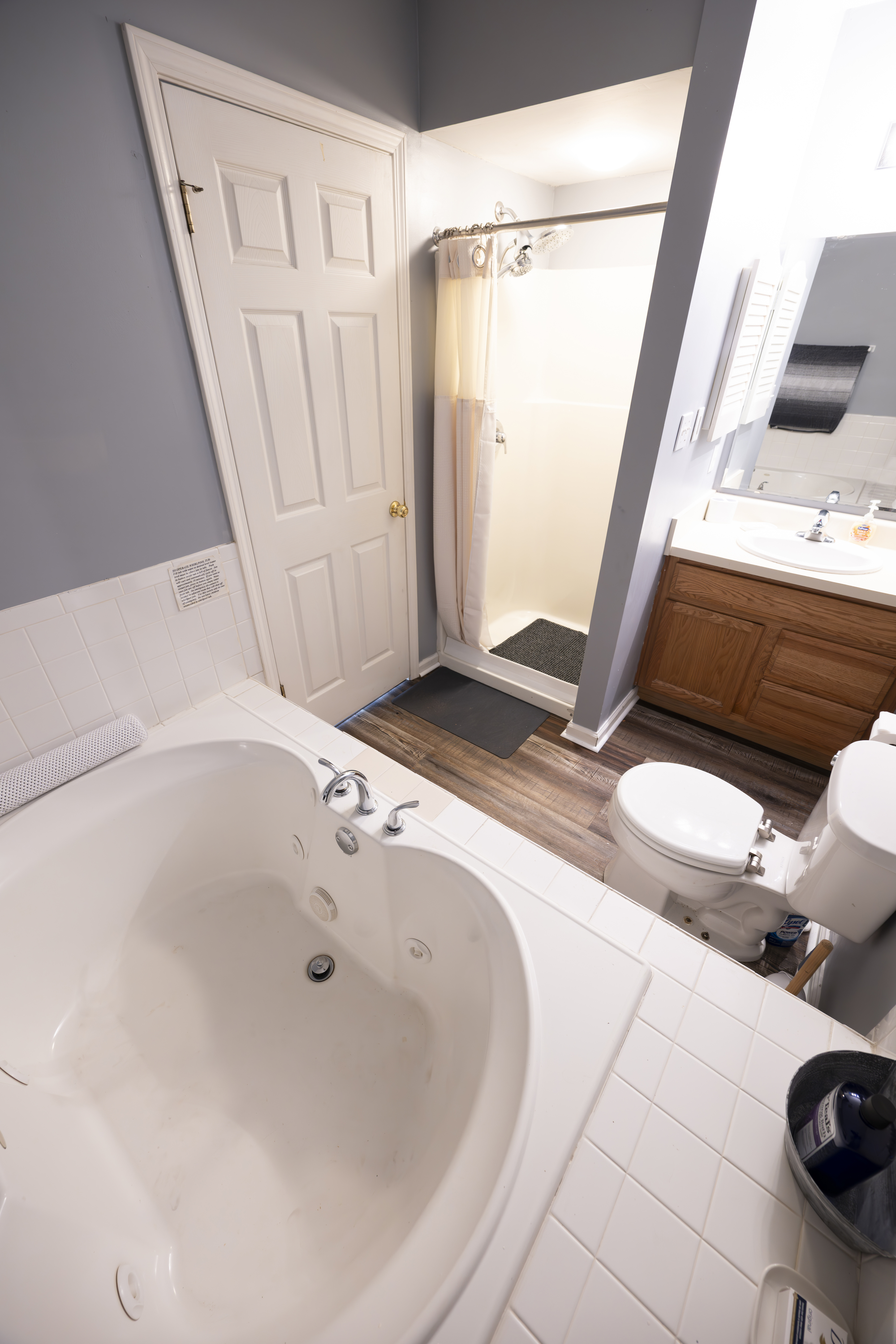 Cabin features one bedroom with a full size bed. A bathroom with a jet tub and stand up shower. A small kitchenette and pull out couch in the living area.